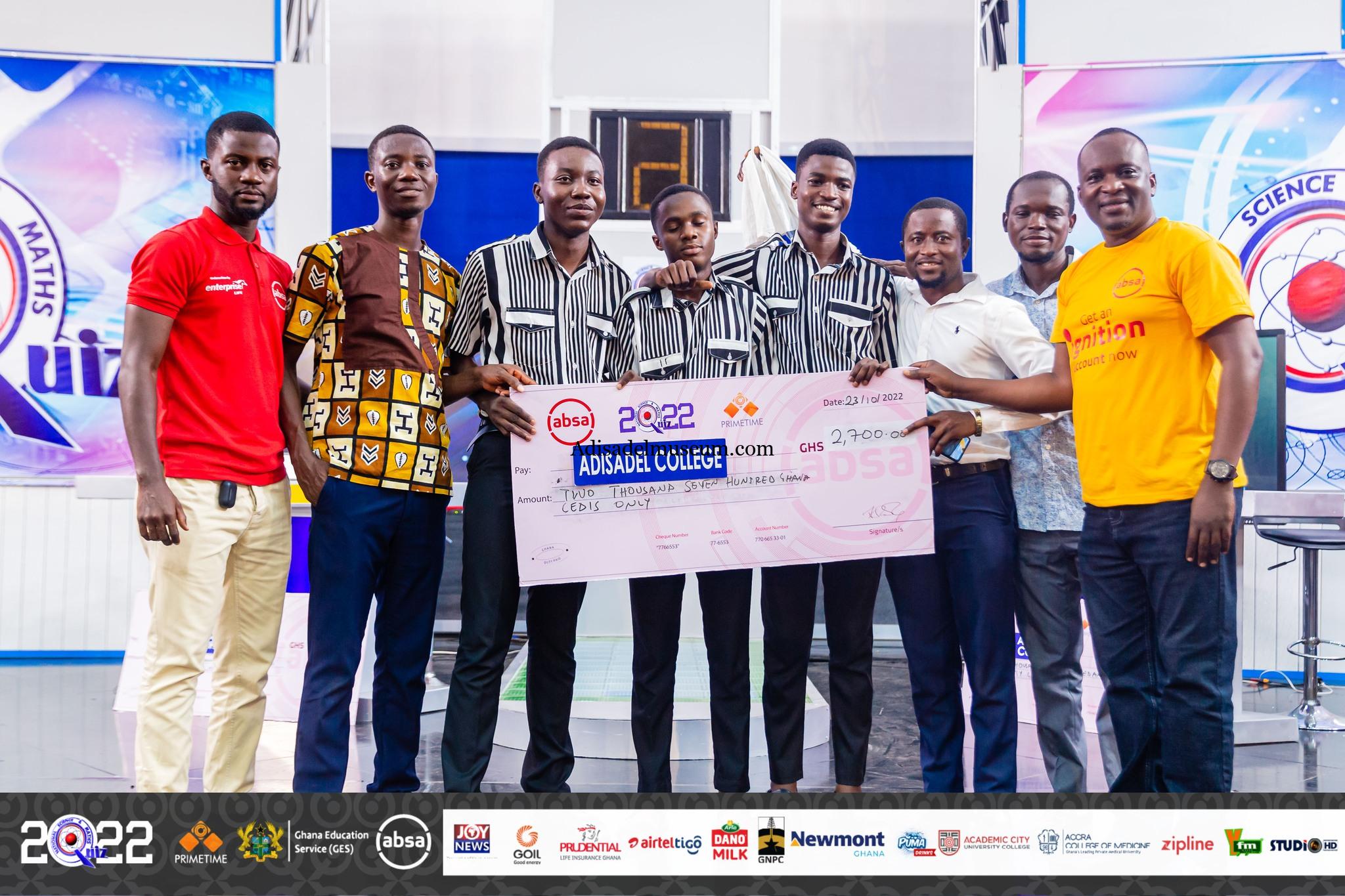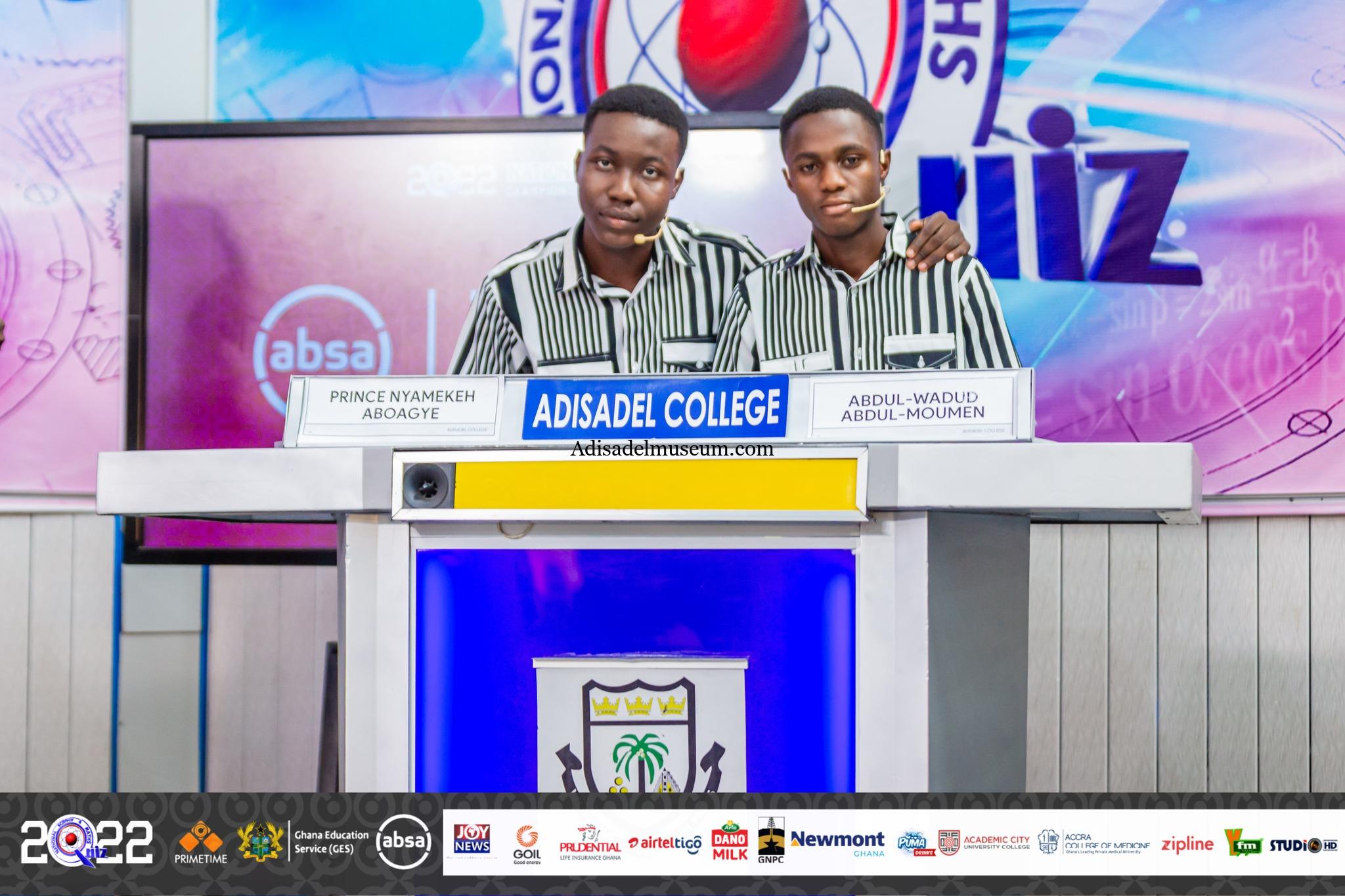 - NSMQ 2022 finalists Prince Nyamekeh Aboagye & Abdul-Wadud Abdul-Moumen receiving the ABSA Money Zone Award from Primetime Limited officials. On the left (in African wear) is Moses Adrah Co-ordinator in charge of Team building, training and selection & Mr Newton Avor (in white) Coordinator in charge of Administration of the Adisadel team.