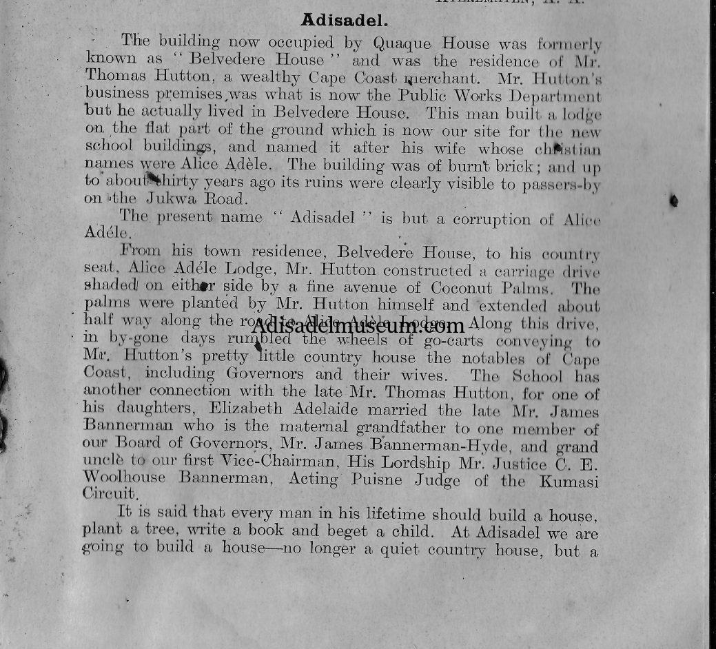 The building now occupied by Quaque House was formerly known as “Belvedere House” and was the residence of Mr. Thomas Hutton, a wealthy Cape Coast merchant. Mr Hutton`s business premises is what is now the Public Works Department but he actually lived in Belvedere House. This man built a lodge on flat part of the ground which is now our site for the new school buildings, and named it after his wife whose Christian names were Alice Adele. The building was of burnt brick; and up to about 30 years ago its ruins were clearly visible to passers-by on the Jukwaa Road.