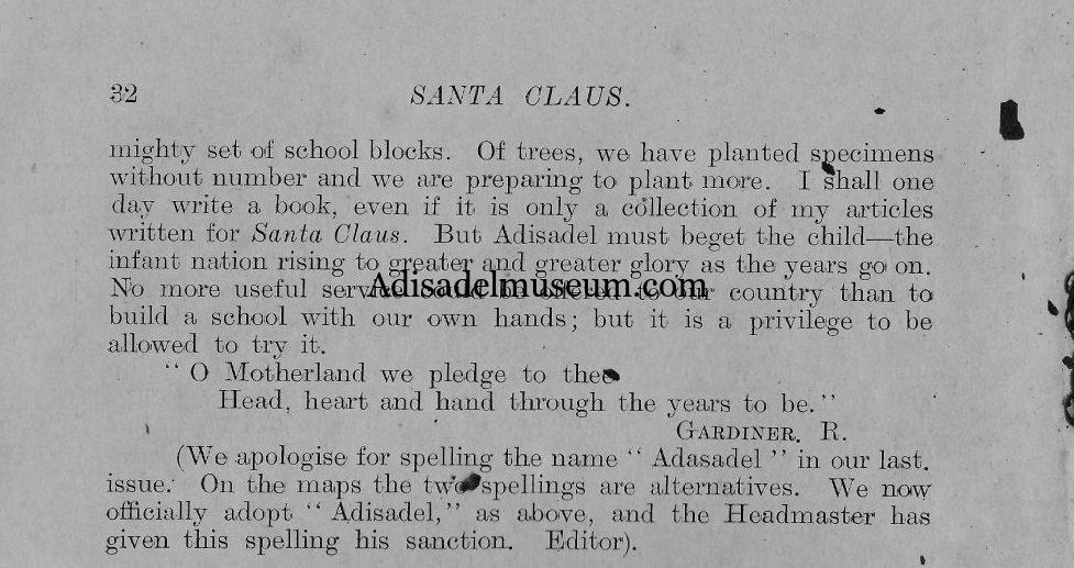 The Present name, “Adisadel” is but a corruption of Alice Adele. The School had the two options of Adasadel and Adisadel. In fact, the editor of the Santa Claus had used the first option of Adasadel before the publishing of Gardiner`s write up which settled on Adisadel stating that the school had officially settled on Adisadel as the legal binding name for the school. The editor corrected, thus:
